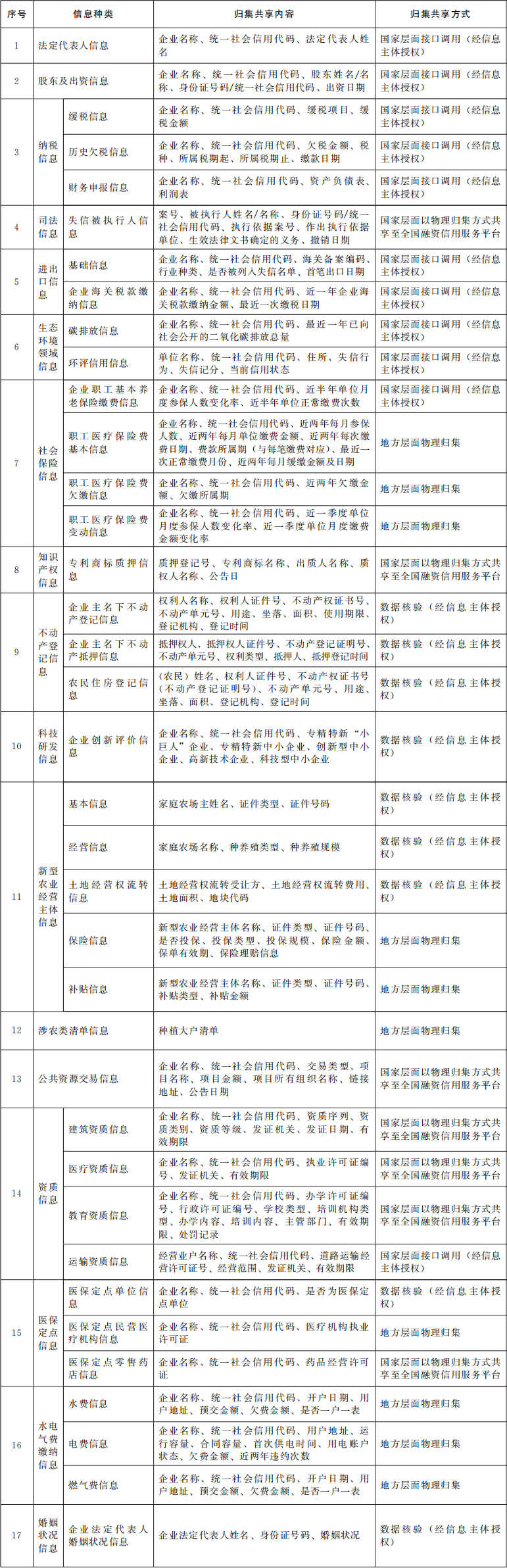 (四)明确信用信息归集共享范围。根据金融机构对信用信息的实际需求,进一步扩大信用信息归集共享范围,将企业主要人员信息、各类资质信息、进出口信息等纳入信用信息归集共享清单(见附件),国家发展改革委牵头适时对清单进行更新。各地区要充分发挥地方融资信用服务平台作用,进一步破除数据壁垒,依法依规加大清单外信用信息归集共享力度,结合本地区实际编制省级信用信息归集共享清单,有效拓展数据归集共享的广度与深度。